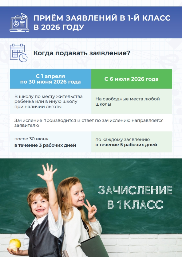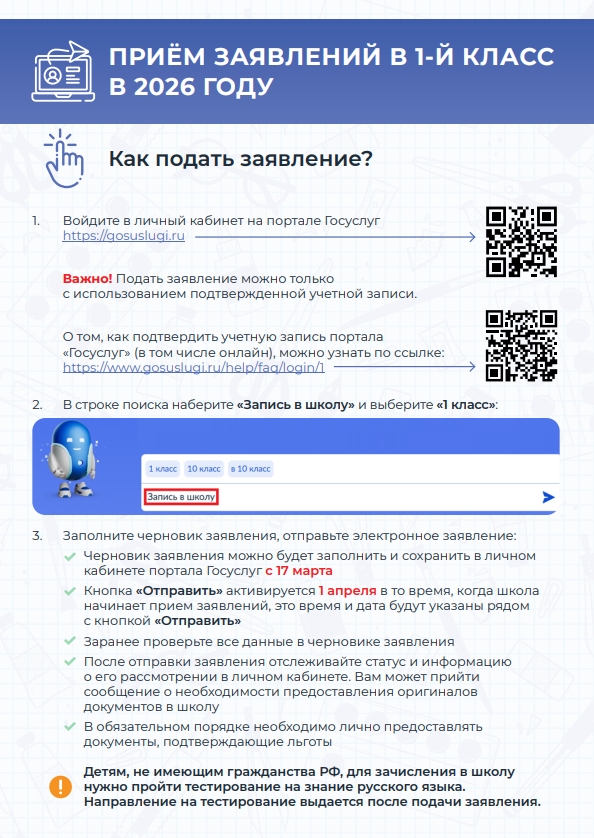 С 1 апреля 2026 года начинается прием заявлений в первые классы. Подать заявление можно через портал Госуслуг. Уже с 17 марта родители могут подготовить черновик и сохранить его в личном кабинете.