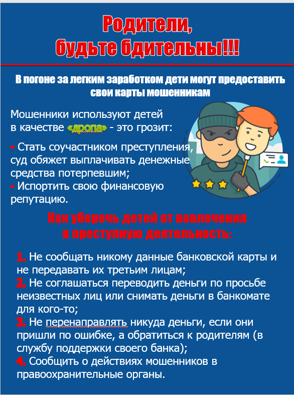 Участились случаи продажи детьми своих банковских карт неустановленным лицам, которые впоследствии используют их в незаконных финансовых схемах, в том числе связанных с мошенничеством, продажей наркотиков, иными преступлениями.
